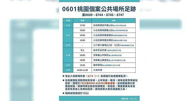Jun 02, 2021 · 桃園市政府公布0602居家人數統計表。 詹賀舜說,疫調足跡以傳統市場及大賣場居多,包括南崁好市多、大湳市場、員林菜市場、大溪第一公有. Jun 02, 2021 · 桃園公布新足跡。(市府提供) 中央流行疫情指揮中心2日宣布桃園新增28起本土確診案例,疫調出爐的19人全都是親友確診接觸,包含5個家庭,桃園市.